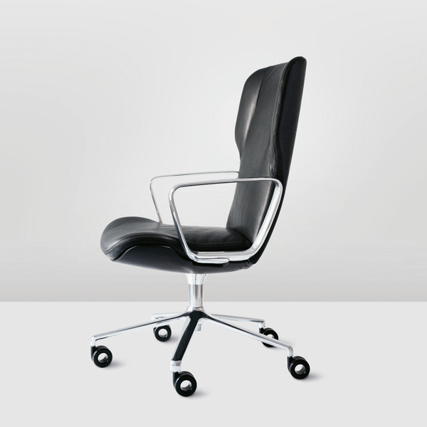 座面下に突出するレバー類をリングアームに一体化したことによって、雑多な印象になりがちな脚まわりもすっきりとした印象に。ドーナツ型のキャスターも、抜け感を演出するのに一役買っています。