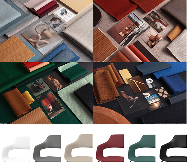 ポリプロピレン製シートシェルは、ホワイト・グレー・ベージュ・シエナレッド・エメラルドグリーン・ブラックの6色展開。ウィルクハーンが提案するインテリアのための4つのカラーボード(Mood Boards)を表現するのに最適なバリエーションです。