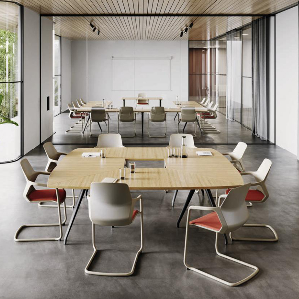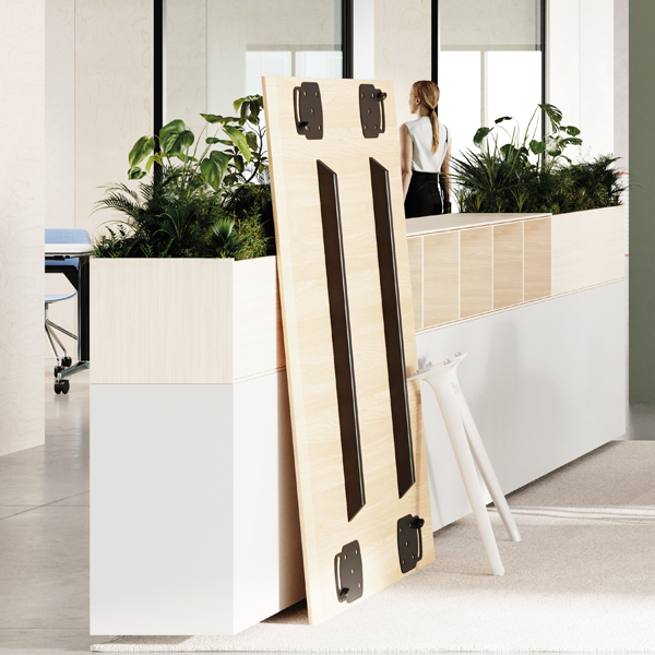 Versaシリーズは1枚の天板の四隅に1本ずつレッグを取り付けた独立型テーブル(最大天板サイズは2600×1200㎜)と、連結用の天板をつなぎあわせる連結テーブルの2タイプがあります。天板同士の連結は、2枚の天板にまたがるようにレッグを取り付けるだけ。オフィスの移転時やレイアウト変更時に、専門の作業員の手を必要とする大作業となりがちな大型テーブルの移動も、Versaなら簡単に、数人の社員の手で短時間に行うことができます。