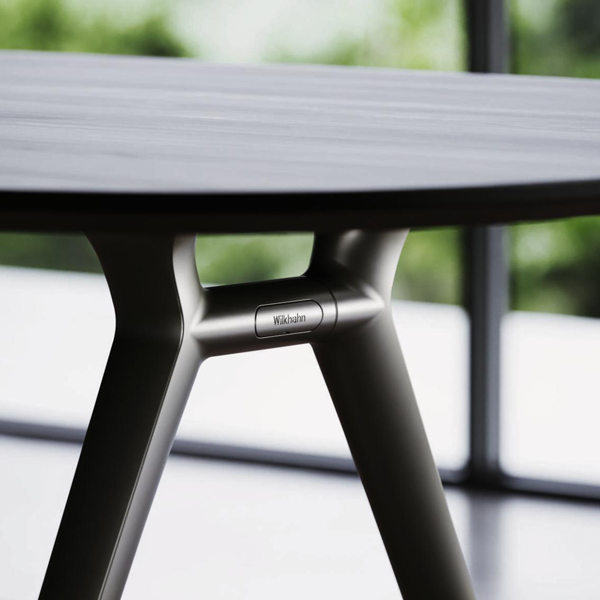 アルミダイキャスト製のA字型のレッグには天板のジョイント付近に抜けがあり、天板が浮き上がっているかのように見える軽やかなデザインです。レッグの仕上げはマットブラック塗装・マットホワイト塗装・艶消し・マットポリッシュの4種類から選択できます。